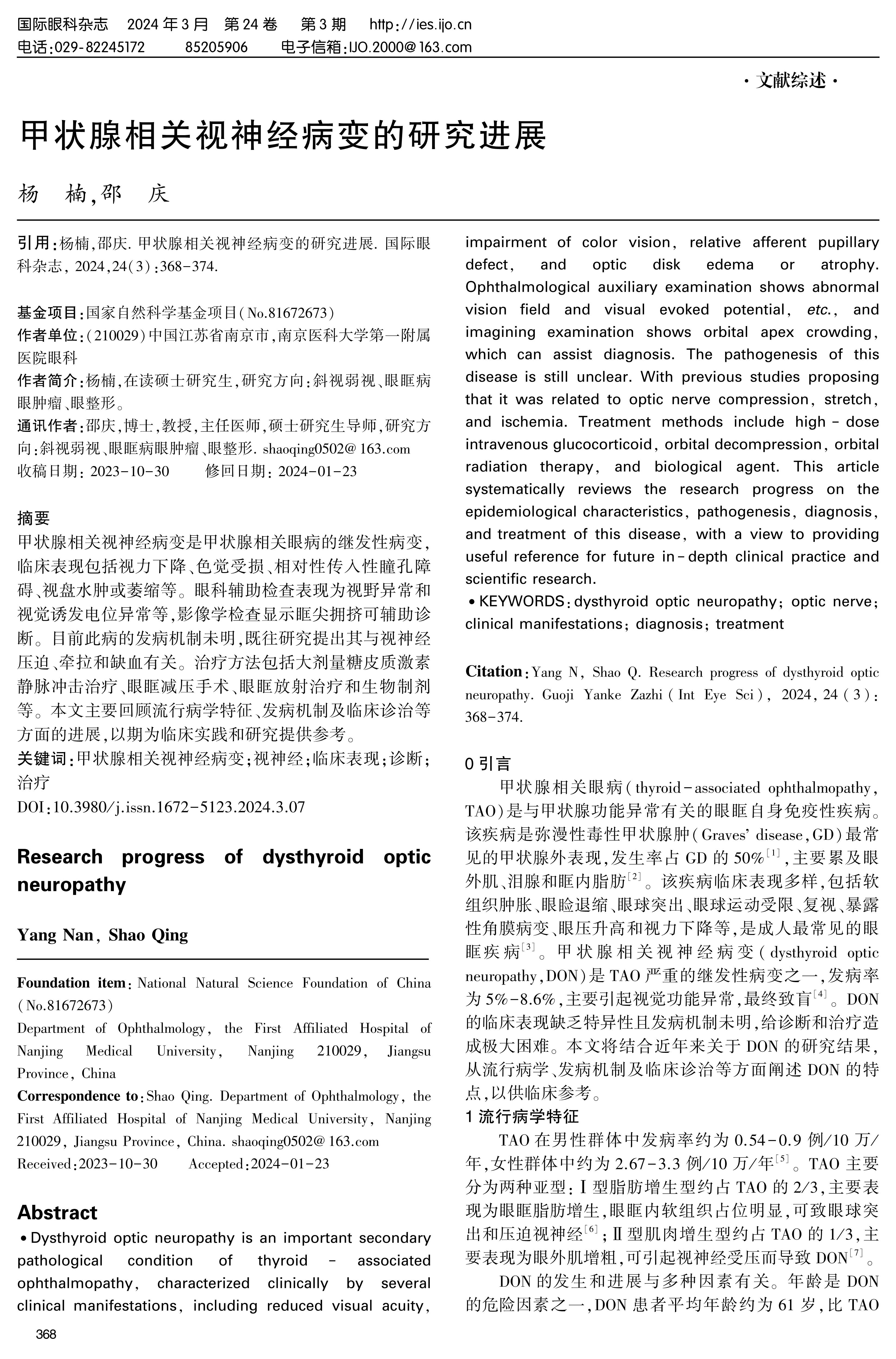 甲状腺相关视神经病变是甲状腺相关眼病的继发性病变,临床表现包括视力下降、色觉受损、相对性传入性瞳孔障碍、视盘水肿或萎缩等。眼科辅助检查表现为视野异常和视觉诱发电位异常等,影像学检查显示眶尖拥挤可辅助诊断。目前此病的发病机制未明,既往研究提出其与视神经压迫、牵拉和缺血有关。治疗方法包括大剂量糖皮质激素静脉冲击治疗、眼眶减压手术、眼眶放射治疗和生物制剂等。本文主要回顾流行病学特征、发病机制及临床诊治等方面的进展,以期为临床实践和研究提供参考。