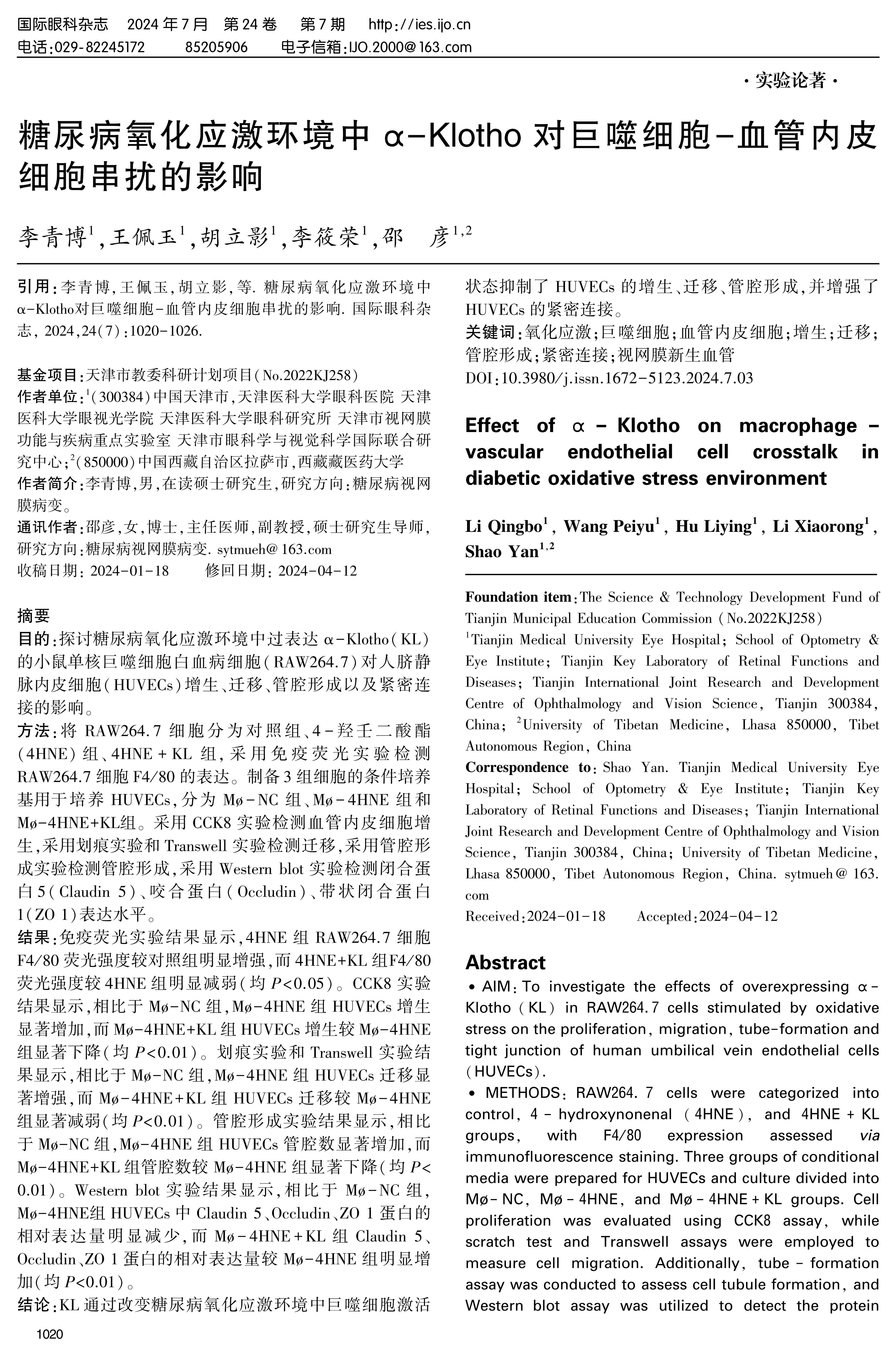 RESULTS:The results of immunofluorescence staining showed that the fluorescence intensity of F4/80 of RAW264.7 cells in the 4HNE group was significantly enhanced compared with the control group, while that of F4/80 in the 4HNE+KL group was significantly decreased compared with the 4HNE group(all P<0.05). The CCK8 assay results revealed a significant increase in the proliferation of HUVECs in the Mø-4HNE group compared with the Mø-NC group. Conversely, the proliferation of the Mø-4HNE+KL group exhibited a significant decrease compared with that in the Mø-4HNE group(all P<0.01). The results of scratch test and Transwell assays demonstrated a significant increase in the migration of HUVECs in the Mø-4HNE group compared with the Mø-NC group, while the migration of the Mø-4HNE+KL group exhibited a significant decrease compared with the Mø-4HNE group(all P<0.01). In the tube-formation assay, it was observed that the number of tubes formed by HUVECs in the Mø-4HNE group was significantly increased compared with the Mø-NC group, while that of tubes formed in the Mø-4HNE+KL group was significantly decreased compared with the Mø-4HNE group(all P<0.01). Additionally, the Western blot results revealed a significant decrease in the relative expression levels of Claudin 5, Occludin, and ZO 1 in the Mø-4HNE group compared with the Mø-NC group. Conversely, in the Mø-4HNE+KL group, there was a significant increase in the relative expression levels of Claudin 5, Occludin, and ZO 1 compared to the Mø-4HNE group(all P<0.01).