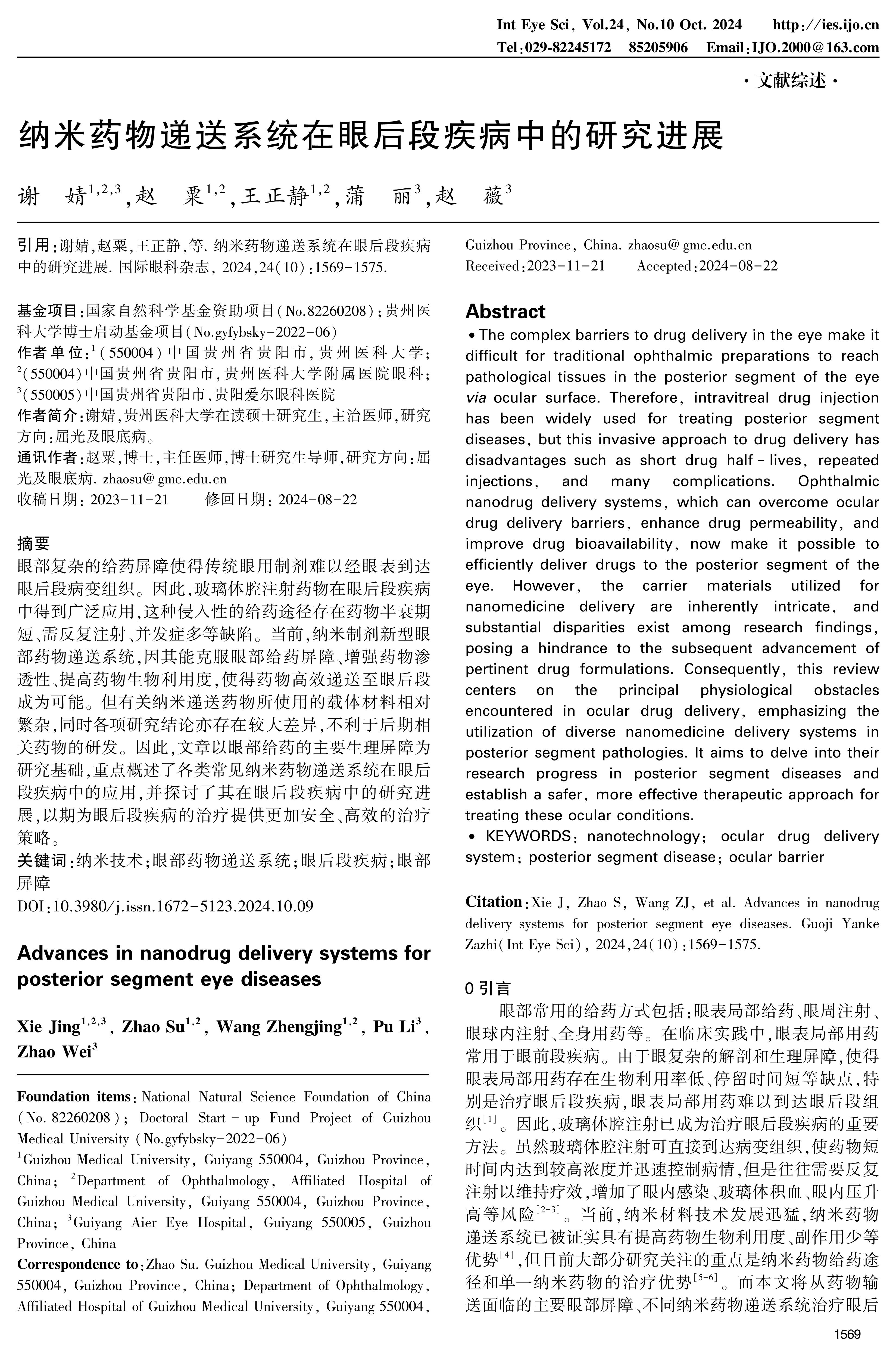 眼部复杂的给药屏障使得传统眼用制剂难以经眼表到达眼后段病变组织。因此,玻璃体腔注射药物在眼后段疾病中得到广泛应用,这种侵入性的给药途径存在药物半衰期短、需反复注射、并发症多等缺陷。当前,纳米制剂新型眼部药物递送系统,因其能克服眼部给药屏障、增强药物渗透性、提高药物生物利用度,使得药物高效递送至眼后段成为可能。但有关纳米递送药物所使用的载体材料相对繁杂,同时各项研究结论亦存在较大差异,不利于后期相关药物的研发。因此,文章以眼部给药的主要生理屏障为研究基础,重点概述了各类常见纳米药物递送系统在眼后段疾病中的应用,并探讨了其在眼后段疾病中的研究进展,以期为眼后段疾病的治疗提供更加安全、高效的治疗策略。