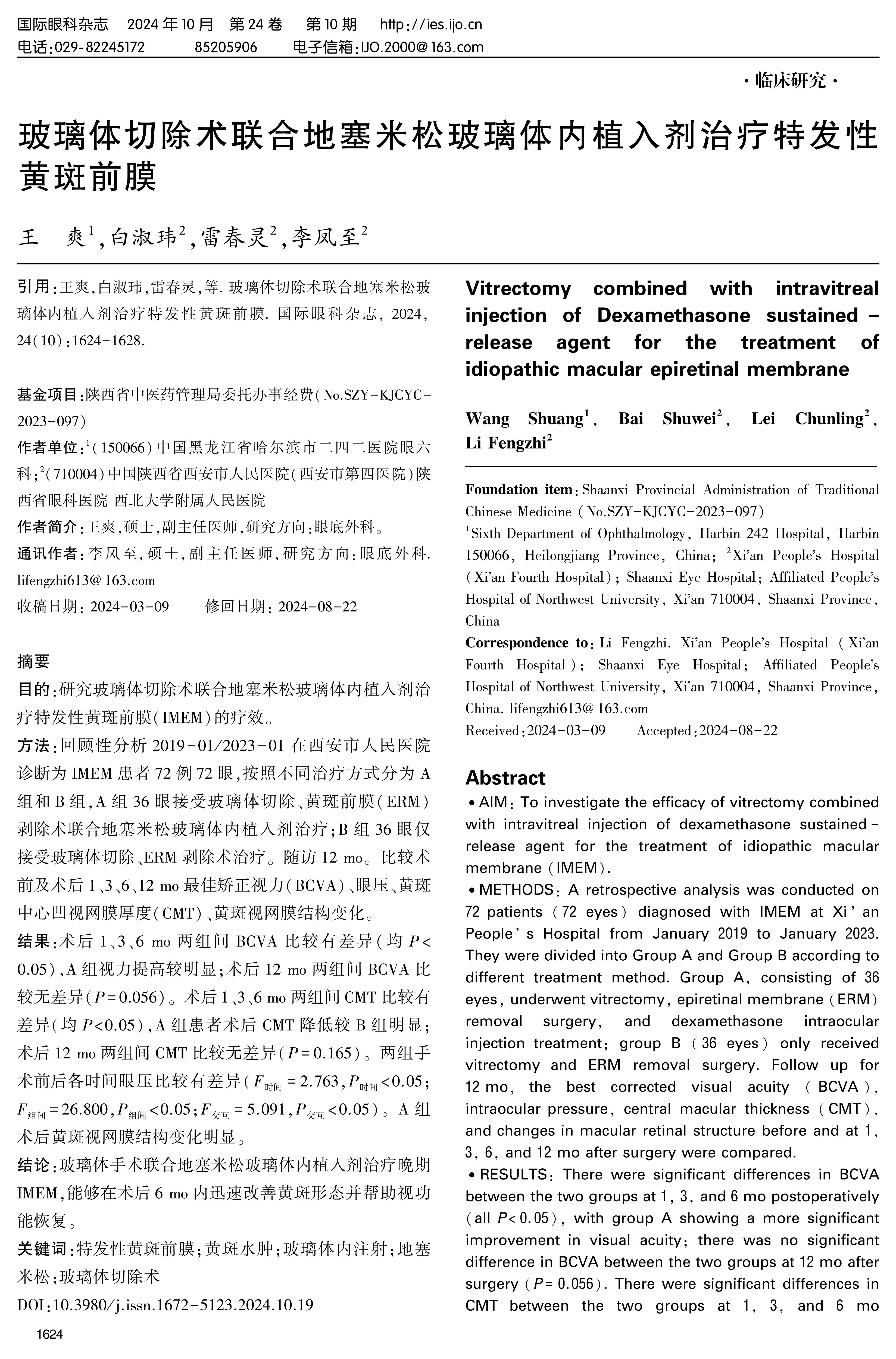 目的:研究玻璃体切除术联合地塞米松玻璃体内植入剂治疗特发性黄斑前膜(IMEM)的疗效。