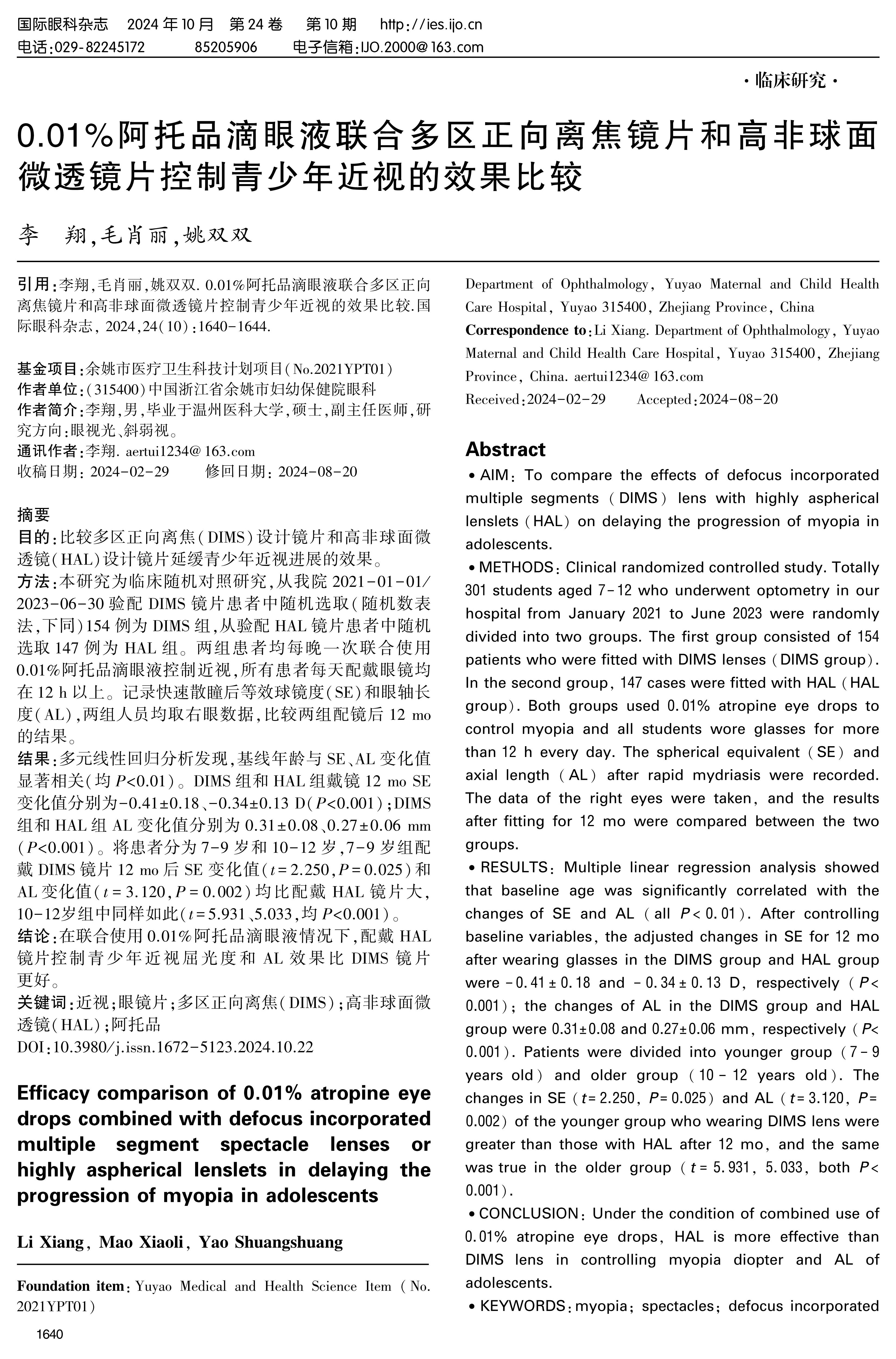 结论:在联合使用0.01%阿托品滴眼液情况下,配戴HAL镜片控制青少年近视屈光度和AL效果比DIMS镜片更好。