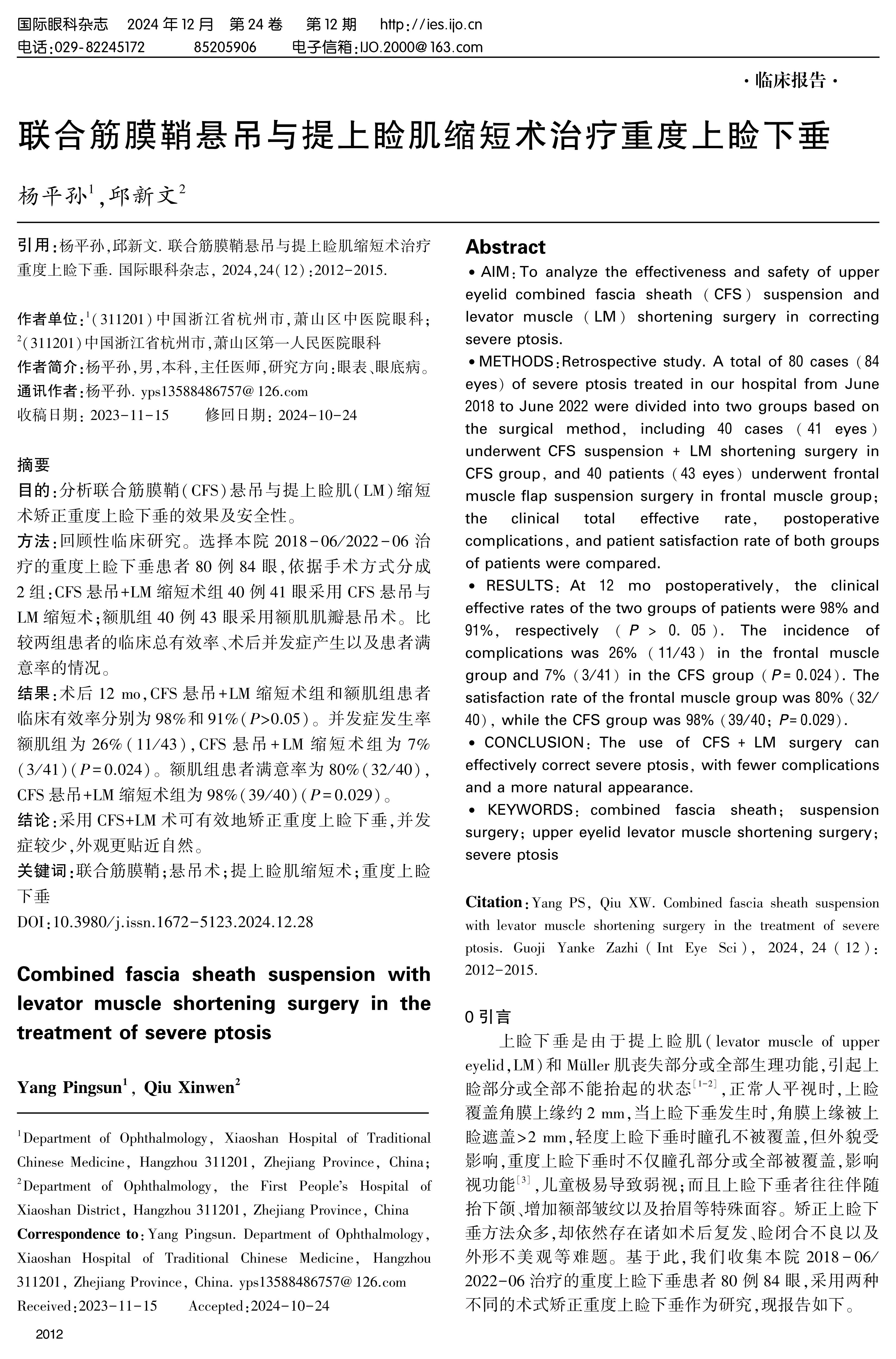 目的:分析联合筋膜鞘(CFS)悬吊与提上睑肌(LM)缩短术矫正重度上睑下垂的效果及安全性。
