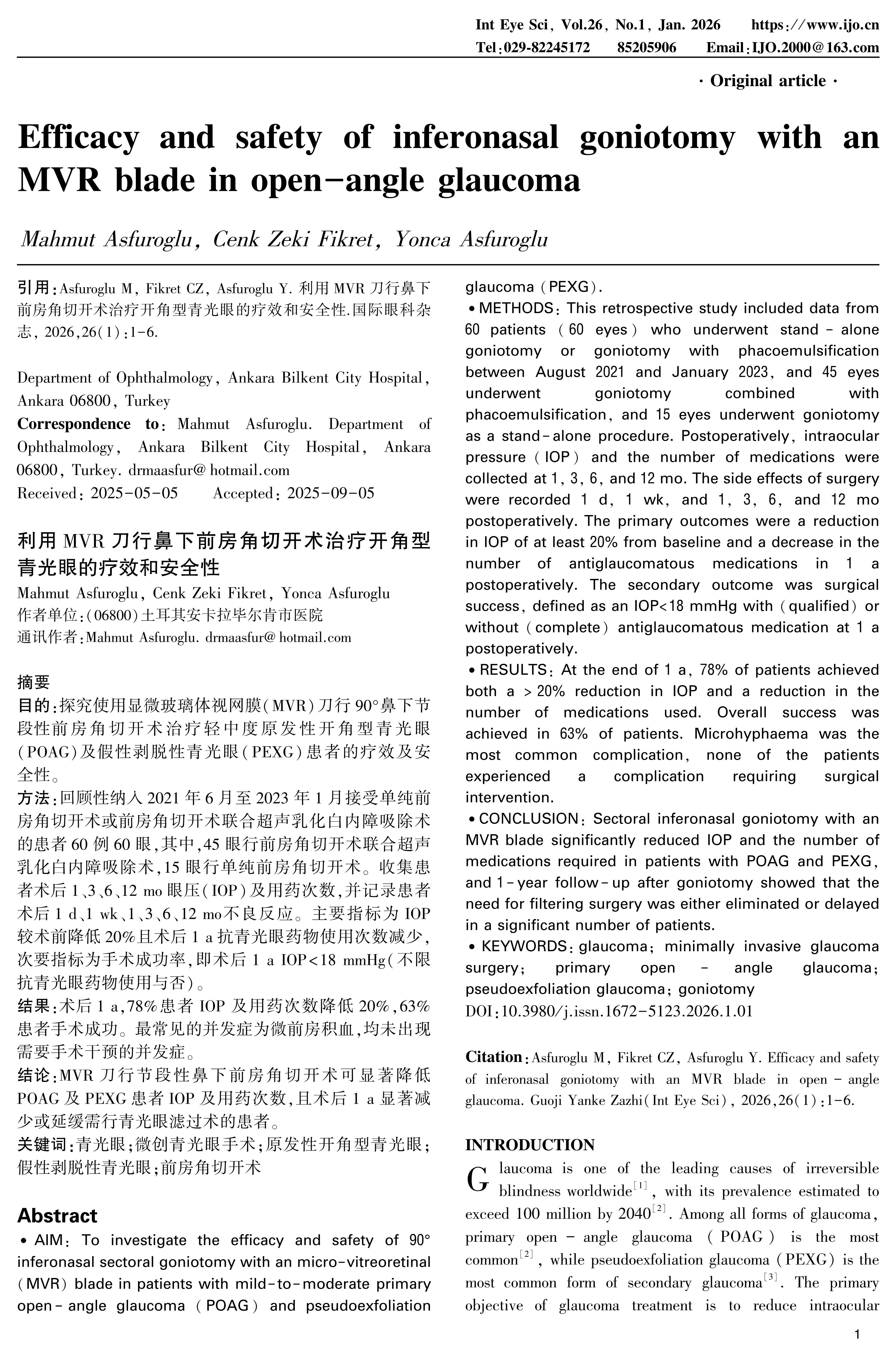 AIM: To investigate the efficacy and safety of 90° inferonasal sectoral goniotomy with an micro-vitreoretinal(MVR)blade in patients with mild-to-moderate primary open-angle glaucoma(POAG)and pseudoexfoliation glaucoma(PEXG).
