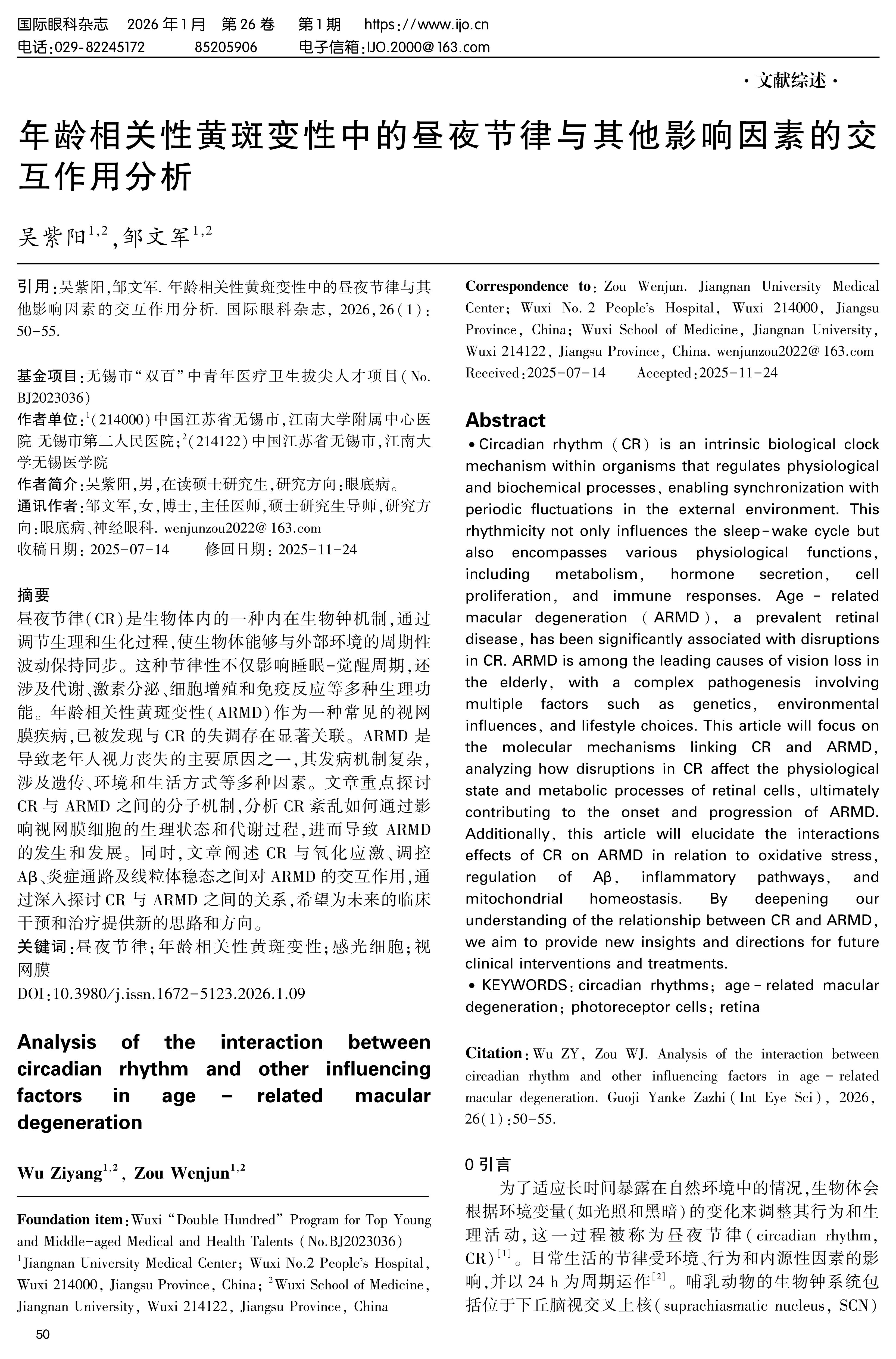 昼夜节律(CR)是生物体内的一种内在生物钟机制,通过调节生理和生化过程,使生物体能够与外部环境的周期性波动保持同步。这种节律性不仅影响睡眠-觉醒周期,还涉及代谢、激素分泌、细胞增殖和免疫反应等多种生理功能。年龄相关性黄斑变性(ARMD)作为一种常见的视网膜疾病,已被发现与CR的失调存在显著关联。ARMD 是导致老年人视力丧失的主要原因之一,其发病机制复杂,涉及遗传、环境和生活方式等多种因素。文章重点探讨CR与 ARMD 之间的分子机制,分析CR紊乱如何通过影响视网膜细胞的生理状态和代谢过程,进而导致 ARMD 的发生和发展。同时,文章阐述CR与氧化应激、调控Aβ、炎症通路及线粒体稳态之间对ARMD的交互作用,通过深入探讨CR与 ARMD 之间的关系,希望为未来的临床干预和治疗提供新的思路和方向。