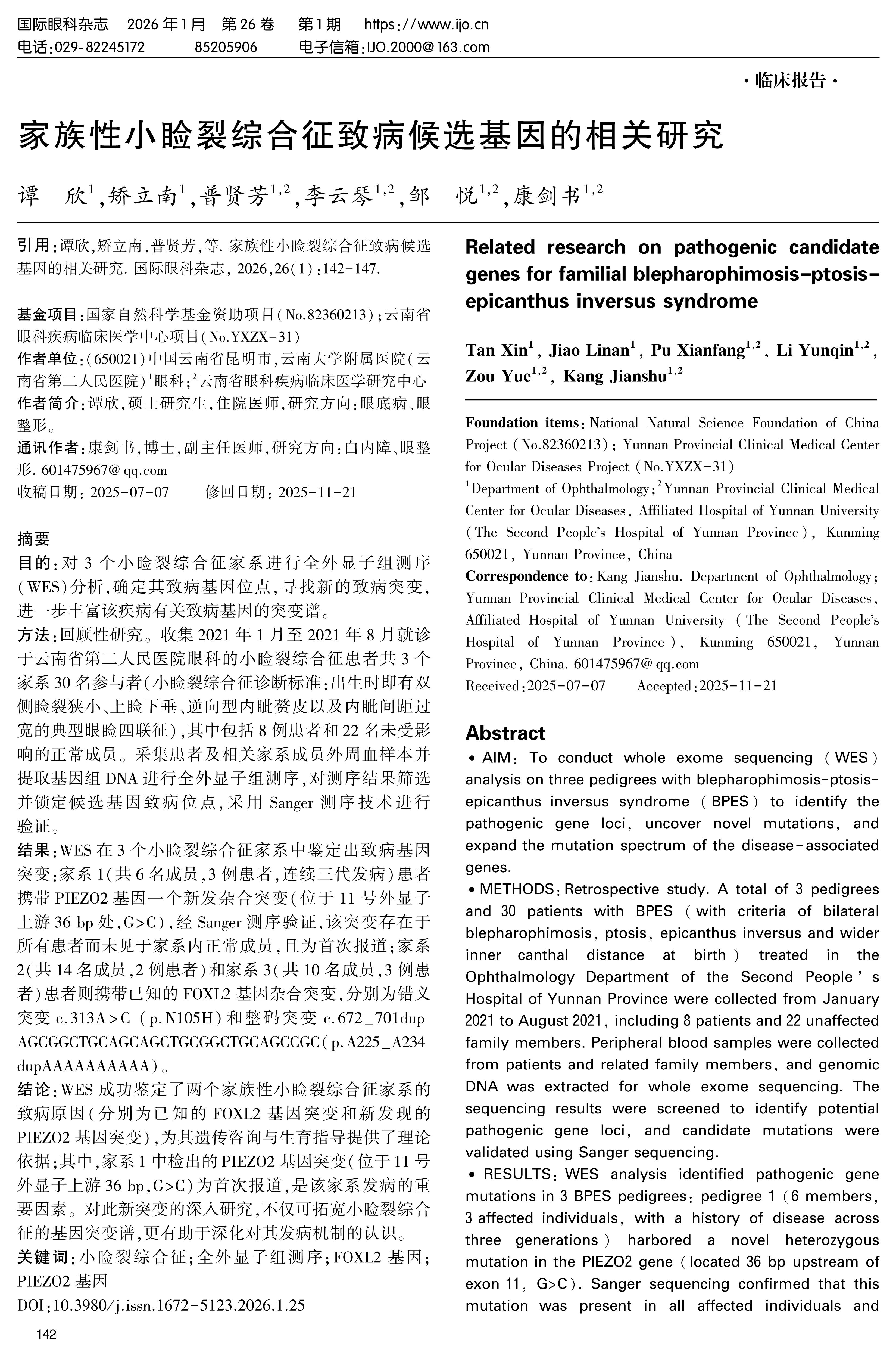 CONCLUSION:WES successfully identified the pathogenesis of familial congenital BPES in two families, including a known FOXL2 gene mutation and a newly discovered PIEZO2 gene mutation. These findings provide a theoretical basis for genetic counseling and reproductive guidance. Notably, the PIEZO2 gene mutation(located 36 bp upstream of exon 11, G>C)discovered in the pedigree 1 is reported for the first time and plays a critical role in the onset of the disease in this family. Further investigation of this new mutation could not only expand the mutation spectrum of BPES, but also enhance our understanding of its pathogenic mechanisms.