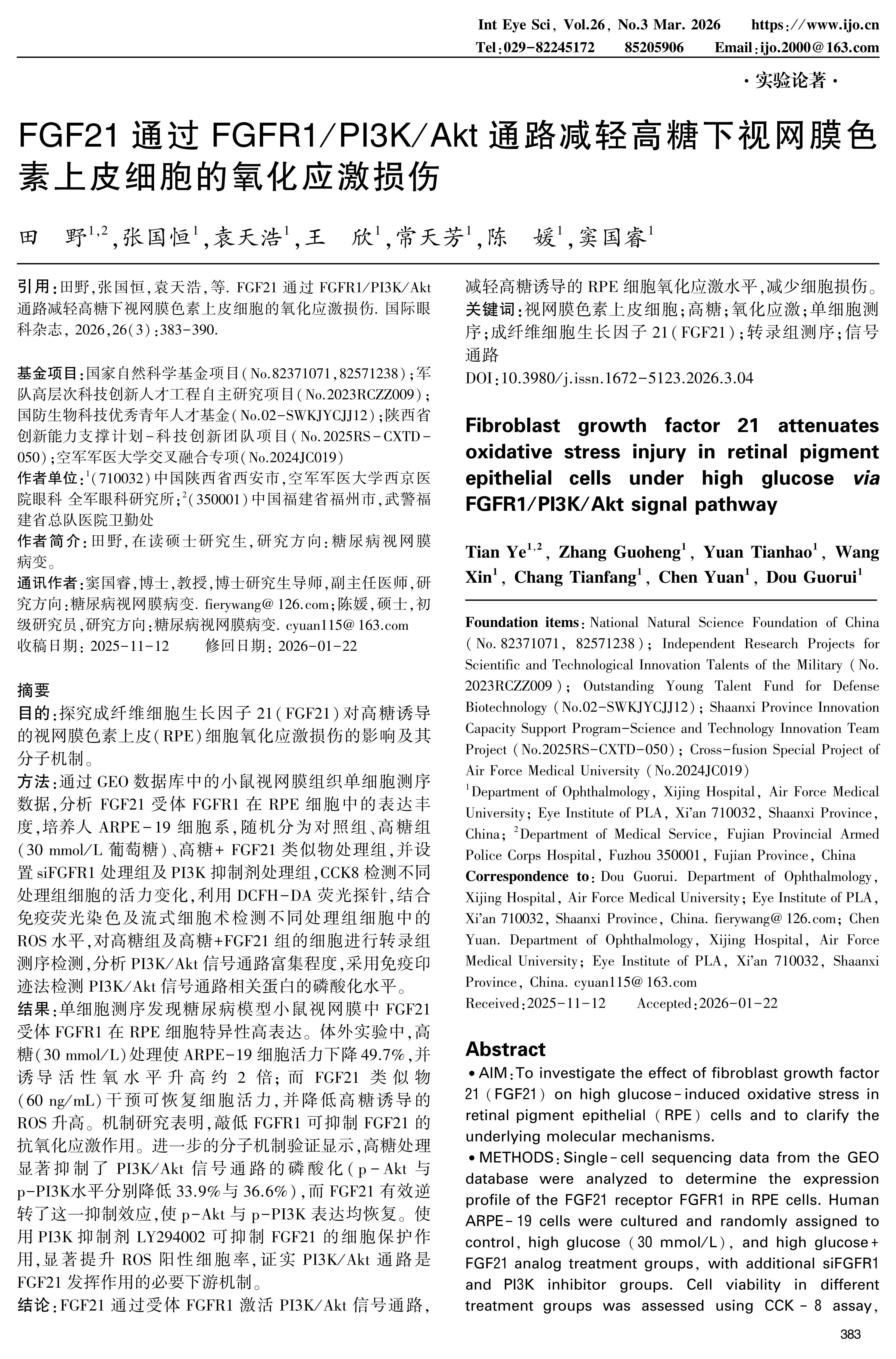 CONCLUSION:FGF21 alleviates high glucose-induced oxidative stress and cellular injury in RPE cells by activating the PI3K/Akt signaling pathway through its receptor FGFR1.