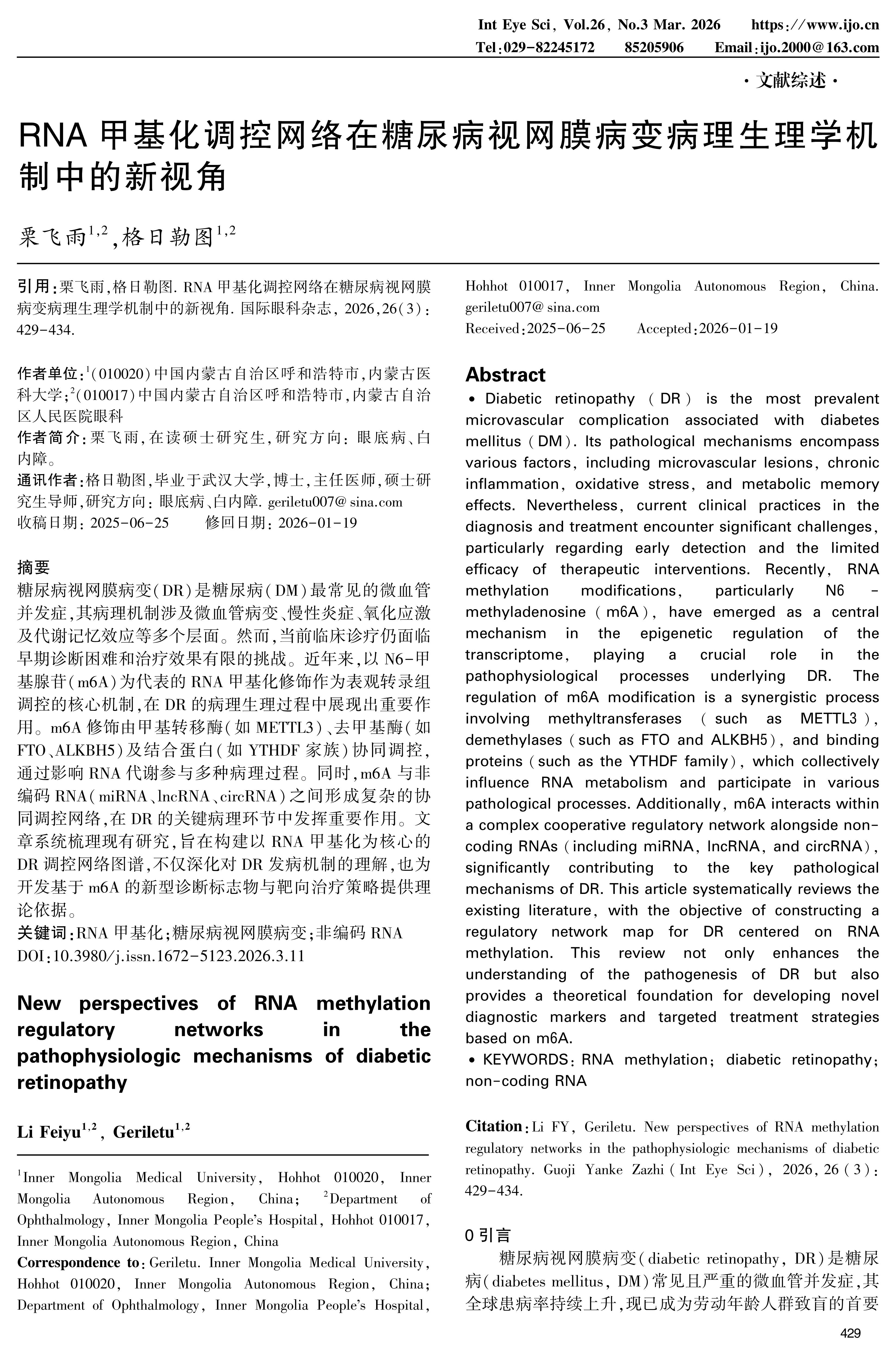 糖尿病视网膜病变(DR)是糖尿病(DM)最常见的微血管并发症,其病理机制涉及微血管病变、慢性炎症、氧化应激及代谢记忆效应等多个层面。然而,当前临床诊疗仍面临早期诊断困难和治疗效果有限的挑战。近年来,以N6-甲基腺苷(m6A)为代表的RNA甲基化修饰作为表观转录组调控的核心机制,在DR的病理生理过程中展现出重要作用。m6A修饰由甲基转移酶(如METTL3)、去甲基酶(如FTO、ALKBH5)及结合蛋白(如YTHDF家族)协同调控,通过影响RNA代谢参与多种病理过程。同时,m6A与非编码RNA(miRNA、lncRNA、circRNA)之间形成复杂的协同调控网络,在DR的关键病理环节中发挥重要作用。文章系统梳理现有研究,旨在构建以RNA甲基化为核心的DR调控网络图谱,不仅深化对DR发病机制的理解,也为开发基于m6A的新型诊断标志物与靶向治疗策略提供理论依据。