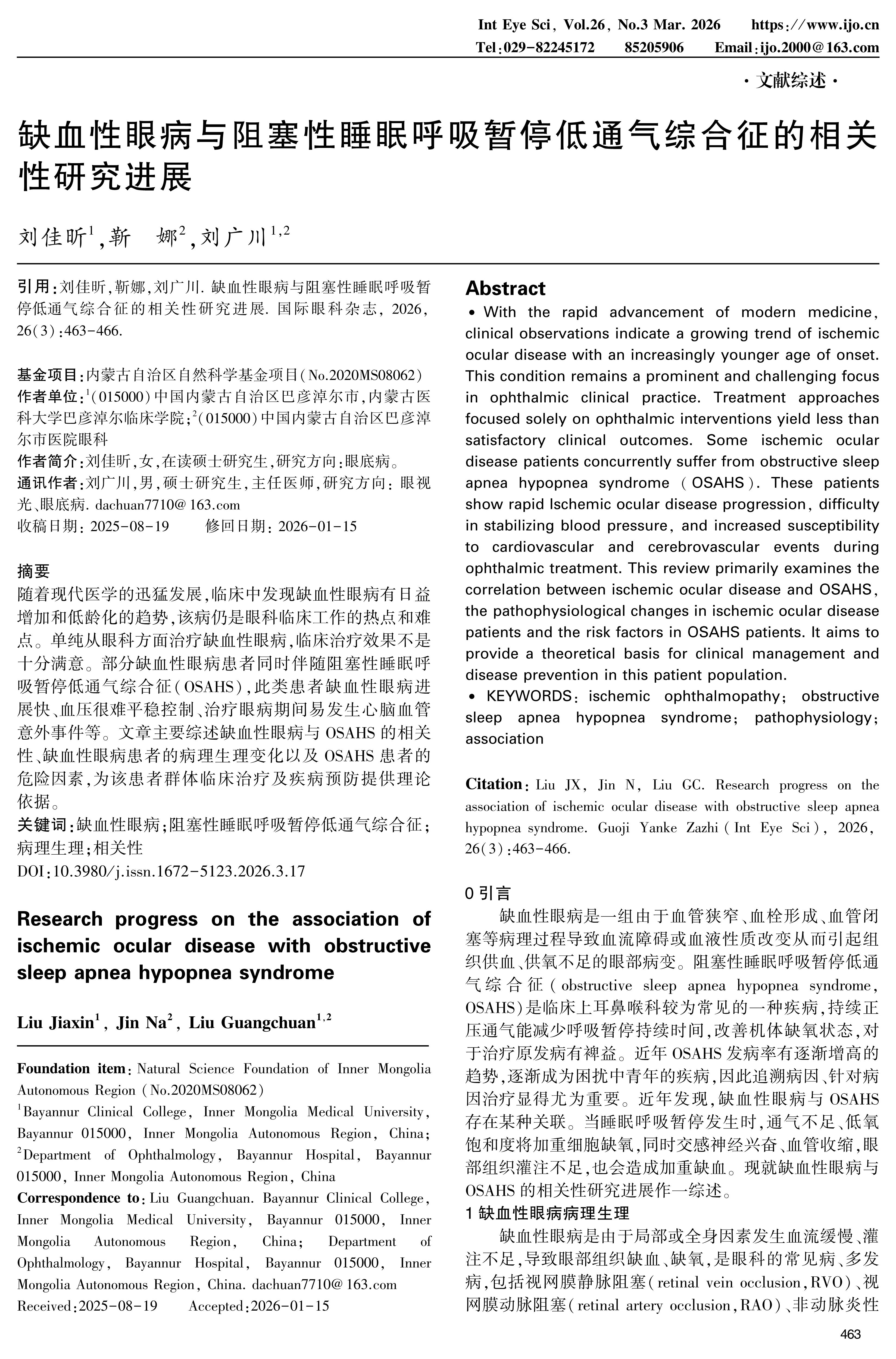 随着现代医学的迅猛发展,临床中发现缺血性眼病有日益增加和低龄化的趋势,该病仍是眼科临床工作的热点和难点。单纯从眼科方面治疗缺血性眼病,临床治疗效果不是十分满意。部分缺血性眼病患者同时伴随阻塞性睡眠呼吸暂停低通气综合征(OSAHS),此类患者缺血性眼病进展快、血压很难平稳控制、治疗眼病期间易发生心脑血管意外事件等。文章主要综述缺血性眼病与OSAHS的相关性、缺血性眼病患者的病理生理变化以及OSAHS患者的危险因素,为该患者群体临床治疗及疾病预防提供理论依据。