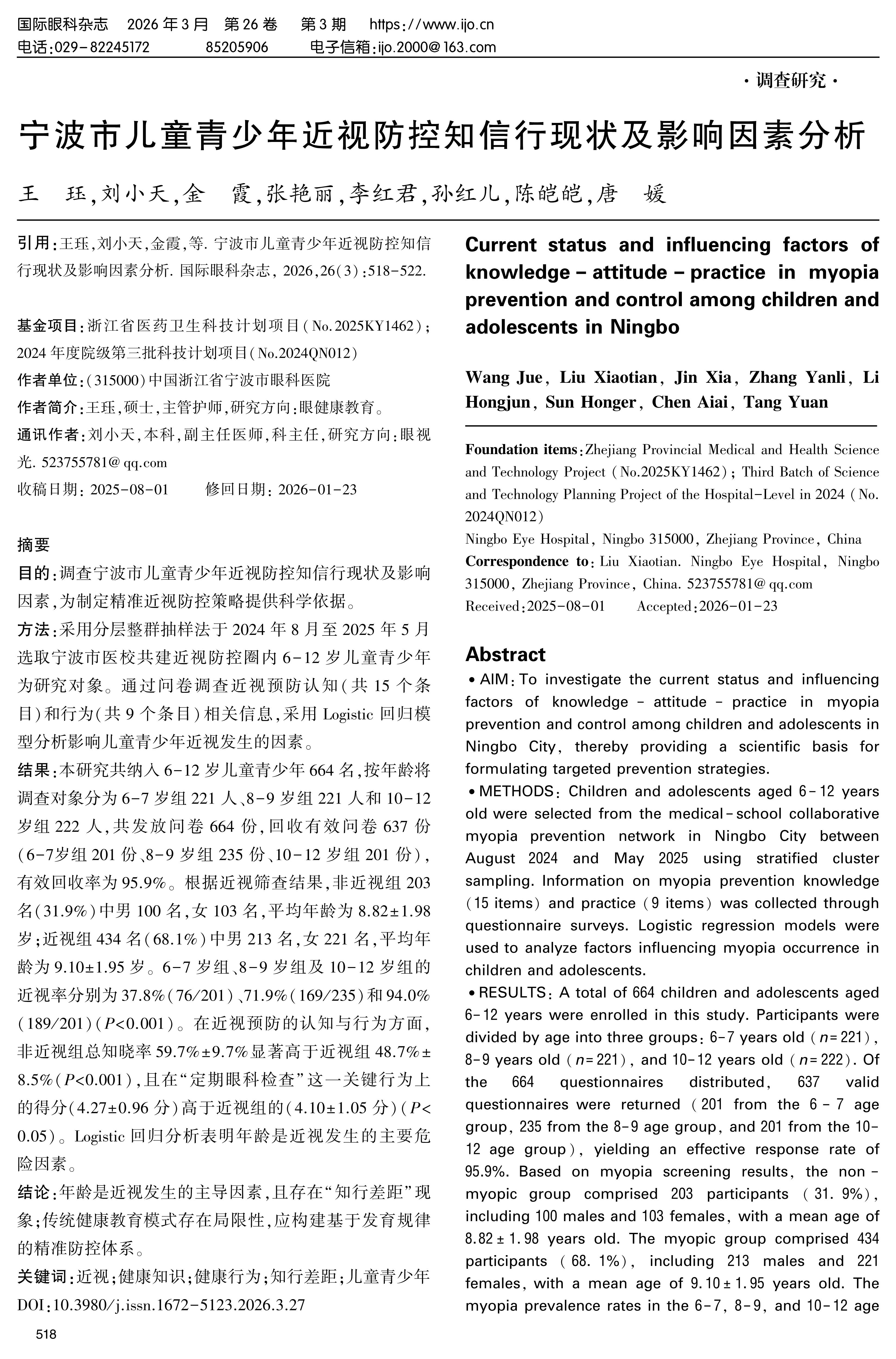RESULTS: A total of 664 children and adolescents aged 6-12 years were enrolled in this study. Participants were divided by age into three groups: 6-7 years old(n=221), 8-9 years old(n=221), and 10-12 years old(n=222). Of the 664 questionnaires distributed, 637 valid questionnaires were returned(201 from the 6-7 age group, 235 from the 8-9 age group, and 201 from the 10-12 age group), yielding an effective response rate of 95.9%. Based on myopia screening results, the non-myopic group comprised 203 participants(31.9%), including 100 males and 103 females, with a mean age of 8.82±1.98 years old. The myopic group comprised 434 participants(68.1%), including 213 males and 221 females, with a mean age of 9.10±1.95 years old. The myopia prevalence rates in the 6-7, 8-9, and 10-12 age groups were 37.8%(76/201), 71.9%(169/235), and 94.0%(189/201), respectively(P<0.001). Regarding the knowledge and practice of myopia prevention, the overall awareness rate in the non-myopic group(59.7%±9.7%)was significantly higher than that in the myopic group(48.7%±8.5%; P<0.001). Additionally, the non-myopic group scored higher on the key practice of “regular eye examinations”(4.27±0.96)compared to the myopic group(4.10±1.05; P<0.05). Logistic regression analysis indicated that age was the primary risk factor for myopia occurrence.