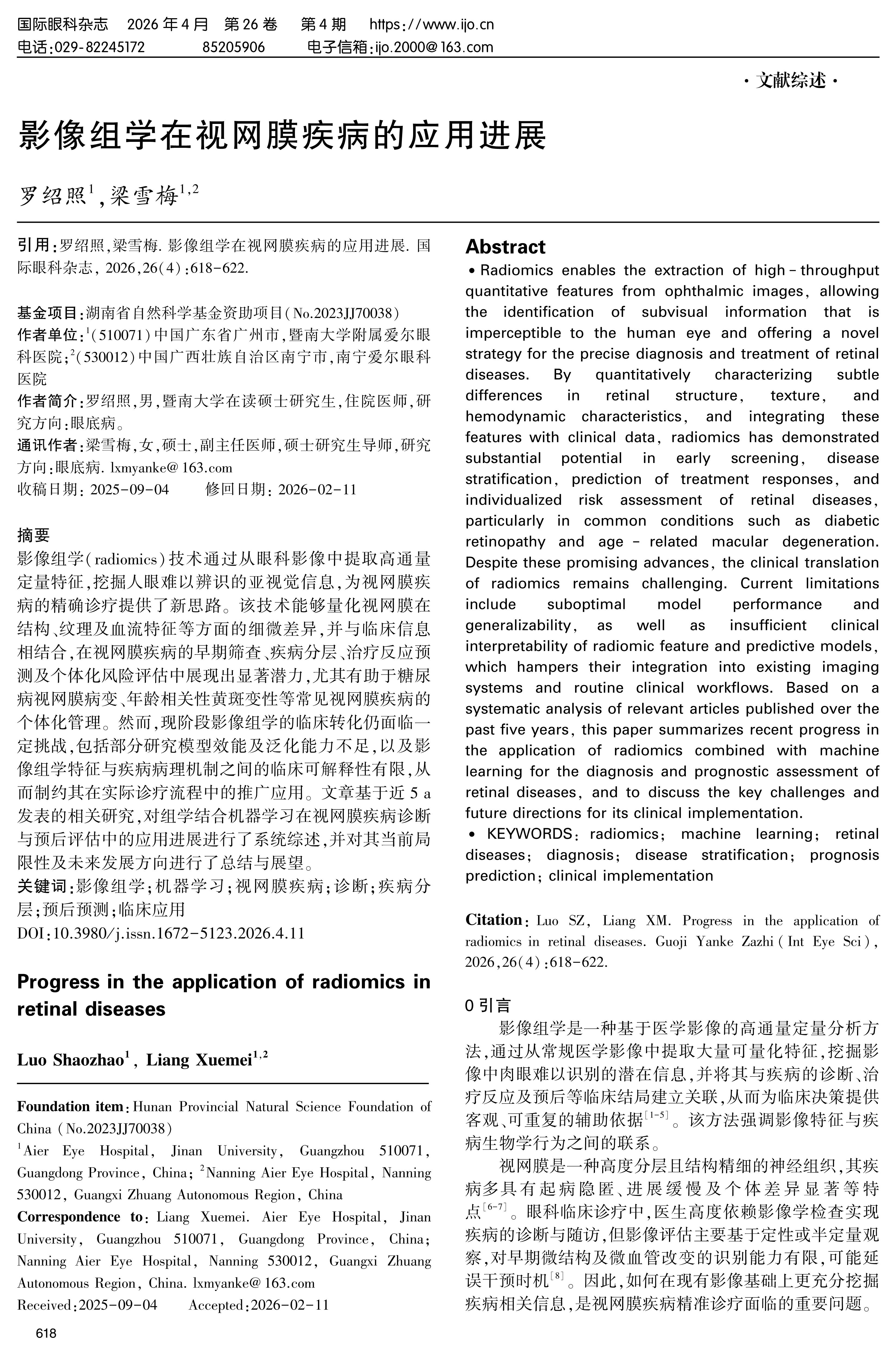 影像组学(radiomics)技术通过从眼科影像中提取高通量定量特征,挖掘人眼难以辨识的亚视觉信息,为视网膜疾病的精确诊疗提供了新思路。该技术能够量化视网膜在结构、纹理及血流特征等方面的细微差异,并与临床信息相结合,在视网膜疾病的早期筛查、疾病分层、治疗反应预测及个体化风险评估中展现出显著潜力,尤其有助于糖尿病视网膜病变、年龄相关性黄斑变性等常见视网膜疾病的个体化管理。然而,现阶段影像组学的临床转化仍面临一定挑战,包括部分研究模型效能及泛化能力不足,以及影像组学特征与疾病病理机制之间的临床可解释性有限,从而制约其在实际诊疗流程中的推广应用。文章基于近 5 a发表的相关研究,对组学结合机器学习在视网膜疾病诊断与预后评估中的应用进展进行了系统综述,并对其当前局限性及未来发展方向进行了总结与展望。