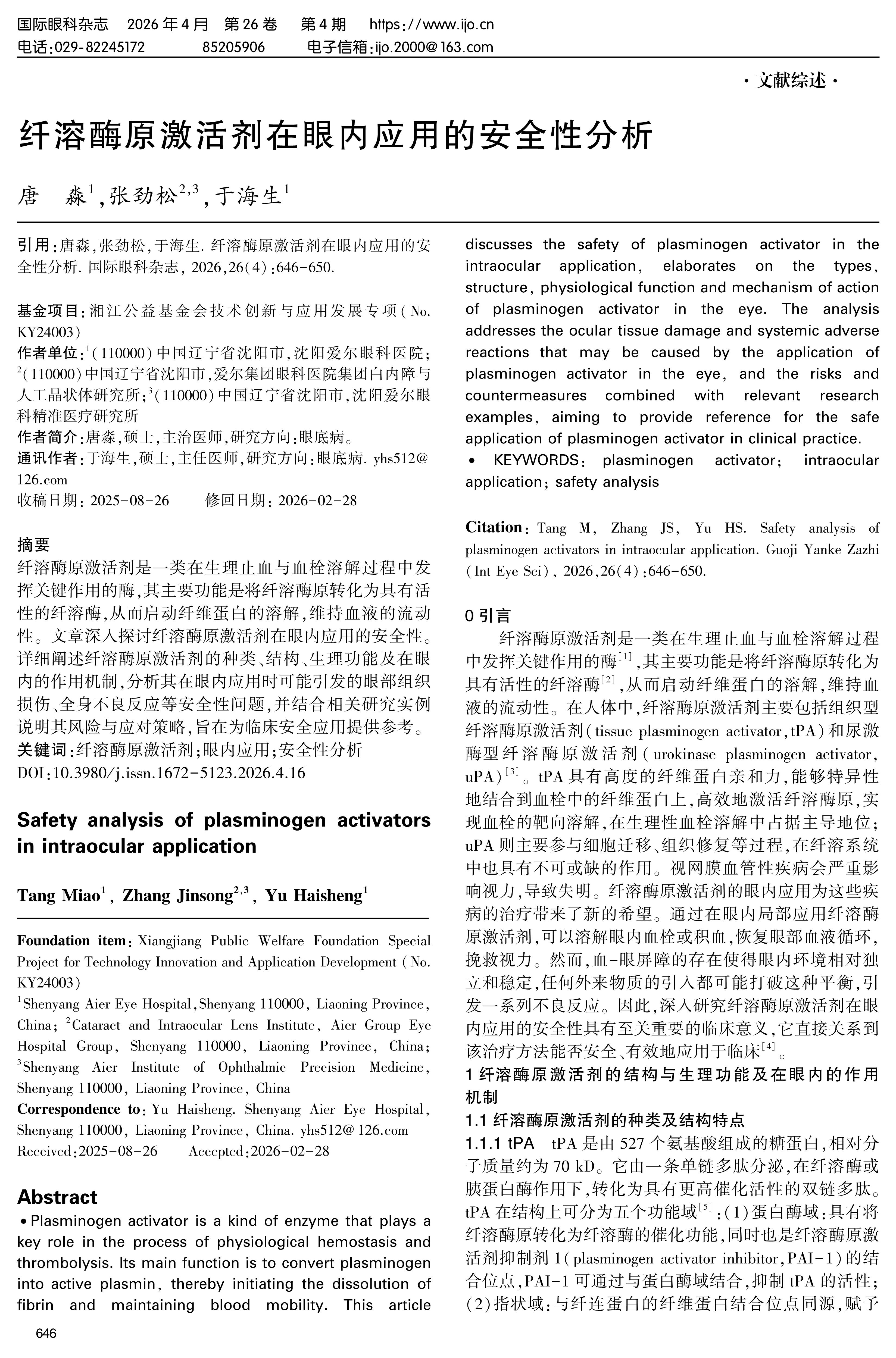 Plasminogen activator is a kind of enzyme that plays a key role in the process of physiological hemostasis and thrombolysis. Its main function is to convert plasminogen into active plasmin, thereby initiating the dissolution of fibrin and maintaining blood mobility. This article discusses the safety of plasminogen activator in the intraocular application, elaborates on the types, structure, physiological function and mechanism of action of plasminogen activator in the eye. The analysis addresses the ocular tissue damage and systemic adverse reactions that may be caused by the application of plasminogen activator in the eye, and the risks and countermeasures combined with relevant research examples, aiming to provide reference for the safe application of plasminogen activator in clinical practice.
