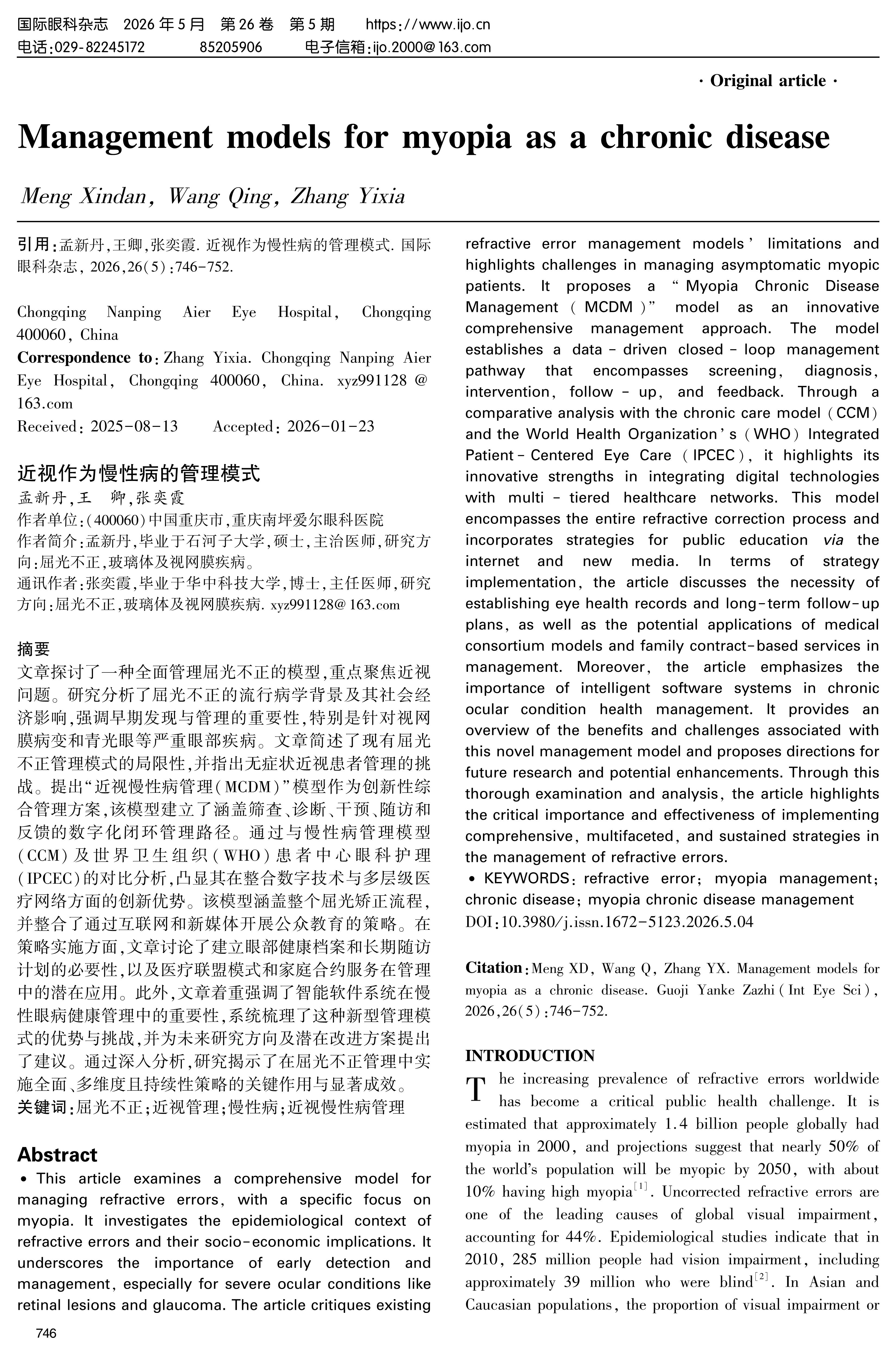 文章探讨了一种全面管理屈光不正的模型,重点聚焦近视问题。研究分析了屈光不正的流行病学背景及其社会经济影响,强调早期发现与管理的重要性,特别是针对视网膜病变和青光眼等严重眼部疾病。文章简述了现有屈光不正管理模式的局限性,并指出无症状近视患者管理的挑战。提出“近视慢性病管理(MCDM)”模型作为创新性综合管理方案,该模型建立了涵盖筛查、诊断、干预、随访和反馈的数字化闭环管理路径。通过与慢性病管理模型(CCM)及世界卫生组织(WHO)患者中心眼科护理(IPCEC)的对比分析,凸显其在整合数字技术与多层级医疗网络方面的创新优势。该模型涵盖整个屈光矫正流程,并整合了通过互联网和新媒体开展公众教育的策略。在策略实施方面,文章讨论了建立眼部健康档案和长期随访计划的必要性,以及医疗联盟模式和家庭合约服务在管理中的潜在应用。此外,文章着重强调了智能软件系统在慢性眼病健康管理中的重要性,系统梳理了这种新型管理模式的优势与挑战,并为未来研究方向及潜在改进方案提出了建议。通过深入分析,研究揭示了在屈光不正管理中实施全面、多维度且持续性策略的关键作用与显著成效。