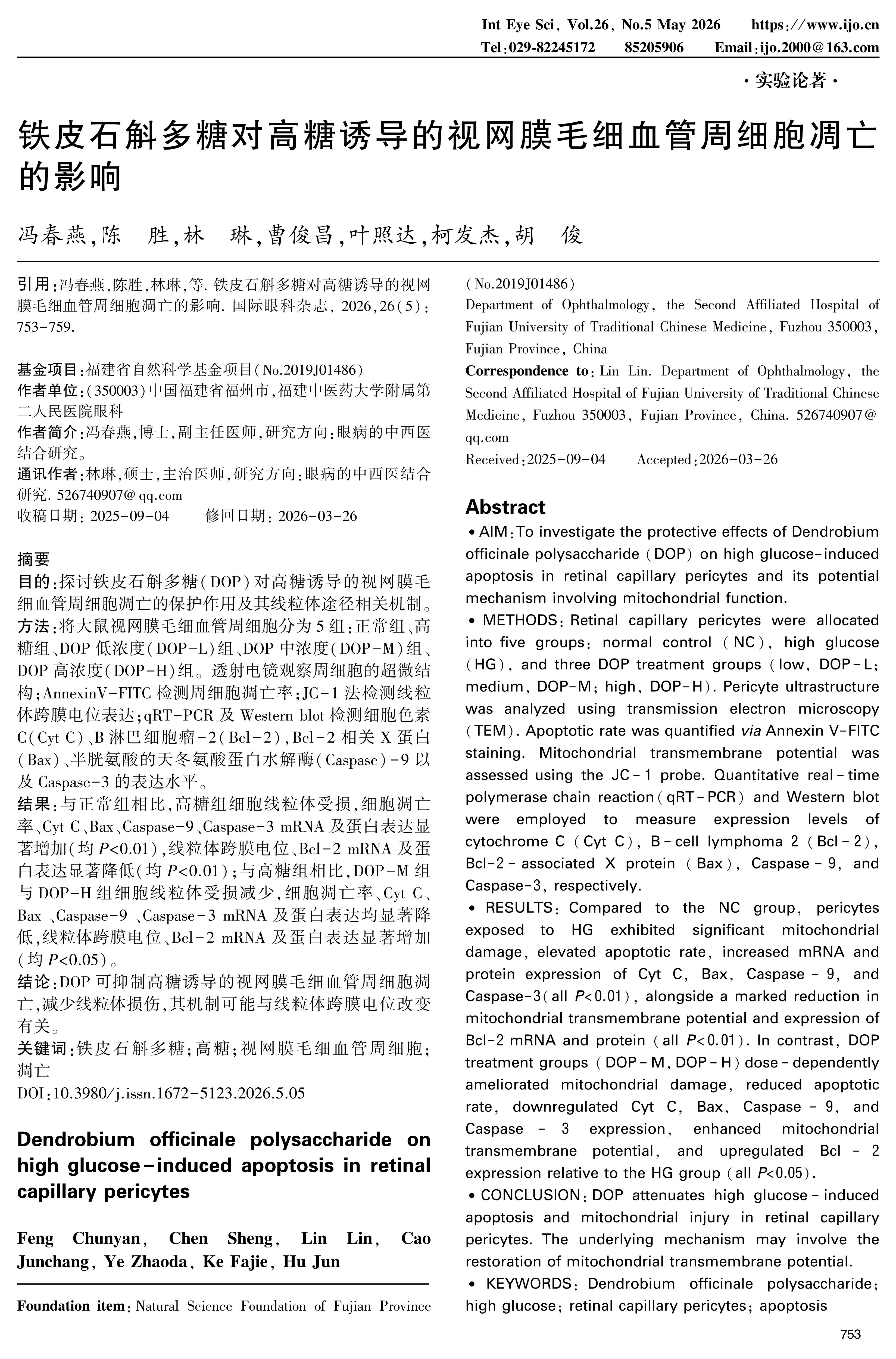 结论:DOP可抑制高糖诱导的视网膜毛细血管周细胞凋亡,减少线粒体损伤,其机制可能与线粒体跨膜电位改变有关。
