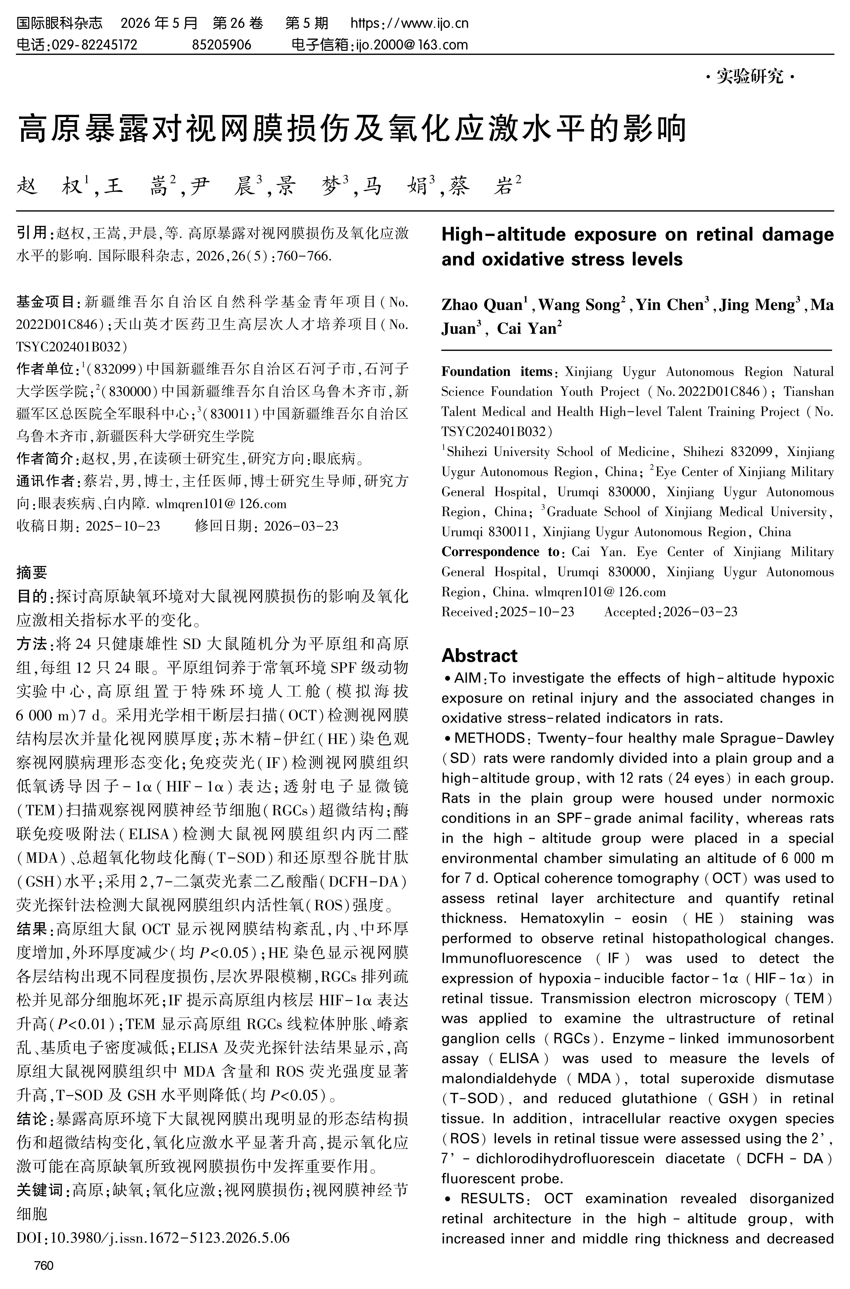 CONCLUSION: Exposure to a high-altitude hypoxic environment induces marked morphological and ultrastructural damage in the rat retina and significantly enhances oxidative stress, suggesting that oxidative stress may play a critical role in retinal injury induced by high-altitude hypoxia.