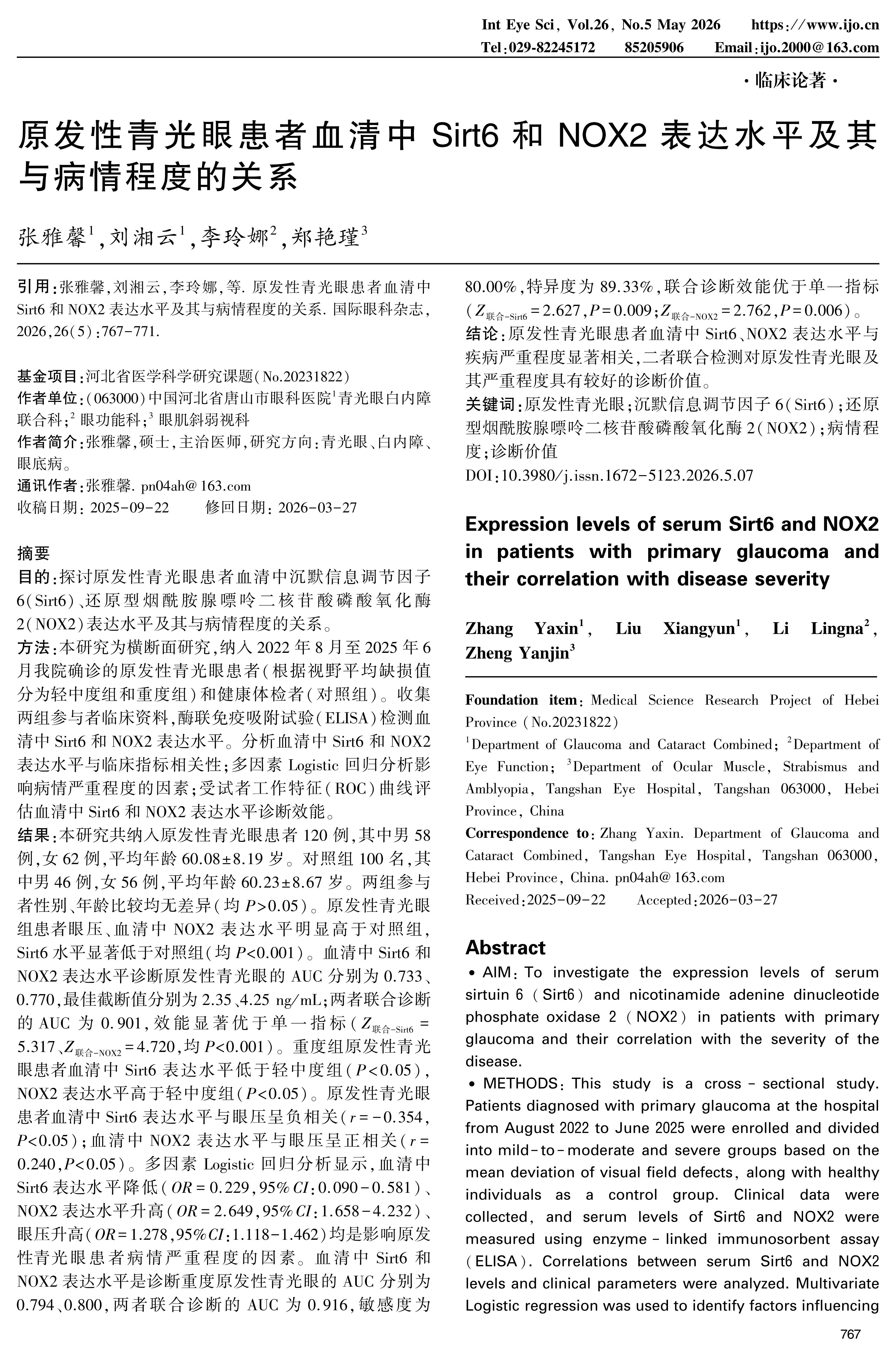 方法:本研究为横断面研究,纳入2022年8月至2025年6月我院确诊的原发性青光眼患者(根据视野平均缺损值分为轻中度组和重度组)和健康体检者(对照组)。收集两组参与者临床资料,酶联免疫吸附试验(ELISA)检测血清中Sirt6和NOX2表达水平。分析血清中Sirt6和NOX2表达水平与临床指标相关性; 多因素Logistic回归分析影响病情严重程度的因素; 受试者工作特征(ROC)曲线评估血清中Sirt6和NOX2表达水平诊断效能。