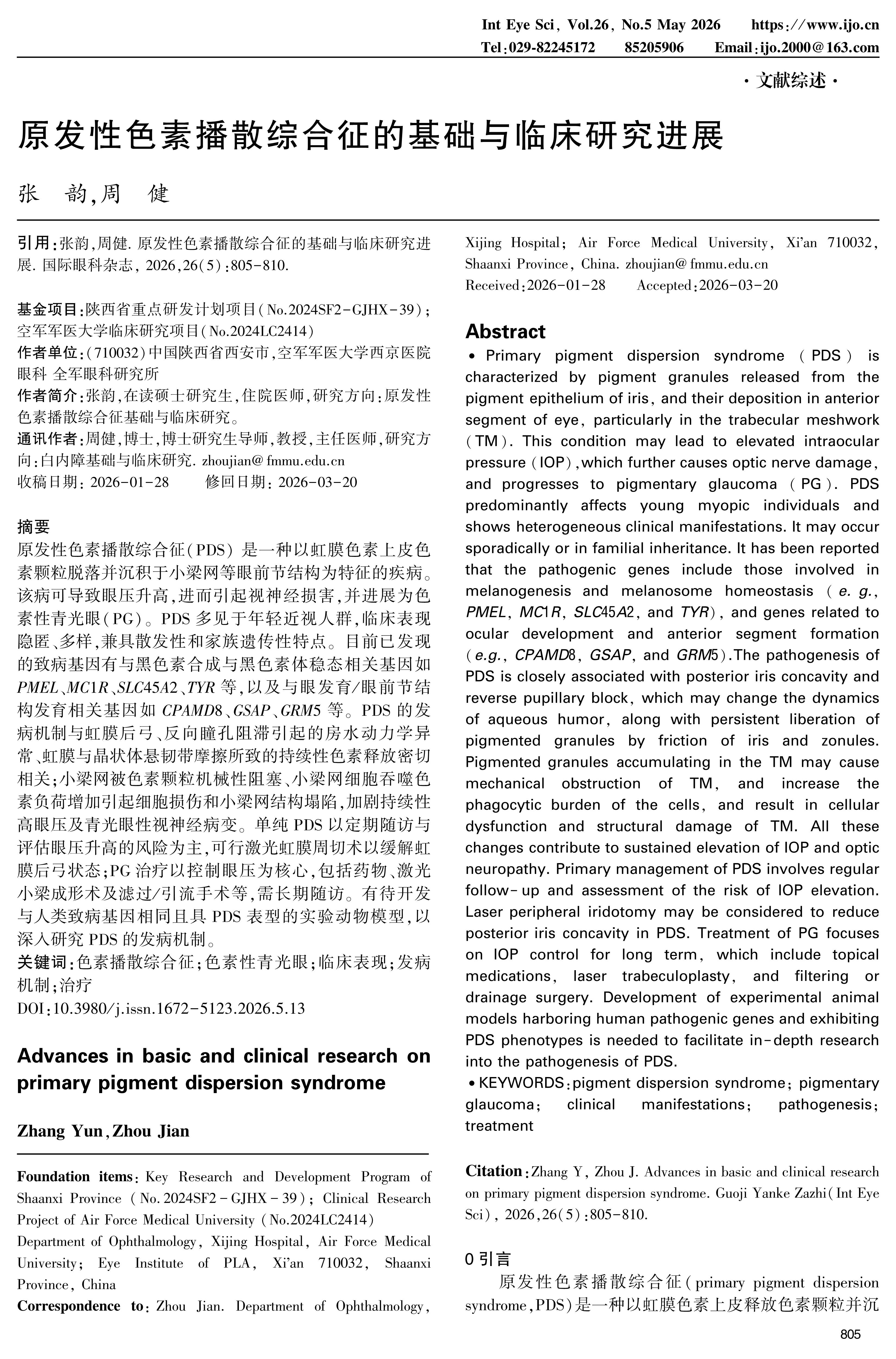 原发性色素播散综合征(PDS)是一种以虹膜色素上皮色素颗粒脱落并沉积于小梁网等眼前节结构为特征的疾病。该病可导致眼压升高,进而引起视神经损害,并进展为色素性青光眼(PG)。PDS多见于年轻近视人群,临床表现隐匿、多样,兼具散发性和家族遗传性特点。目前已发现的致病基因有与黑色素合成与黑色素体稳态相关基因如PMEL、MC1R、SLC45A2、TYR等,以及与眼发育/眼前节结构发育相关基因如CPAMD8、GSAP、GRM5等。PDS的发病机制与虹膜后弓、反向瞳孔阻滞引起的房水动力学异常、虹膜与晶状体悬韧带摩擦所致的持续性色素释放密切相关; 小梁网被色素颗粒机械性阻塞、小梁网细胞吞噬色素负荷增加引起细胞损伤和小梁网结构塌陷,加剧持续性高眼压及青光眼性视神经病变。单纯PDS以定期随访与评估眼压升高的风险为主,可行激光虹膜周切术以缓解虹膜后弓状态; PG治疗以控制眼压为核心,包括药物、激光小梁成形术及滤过/引流手术等,需长期随访。有待开发与人类致病基因相同且具PDS表型的实验动物模型,以深入研究PDS的发病机制。