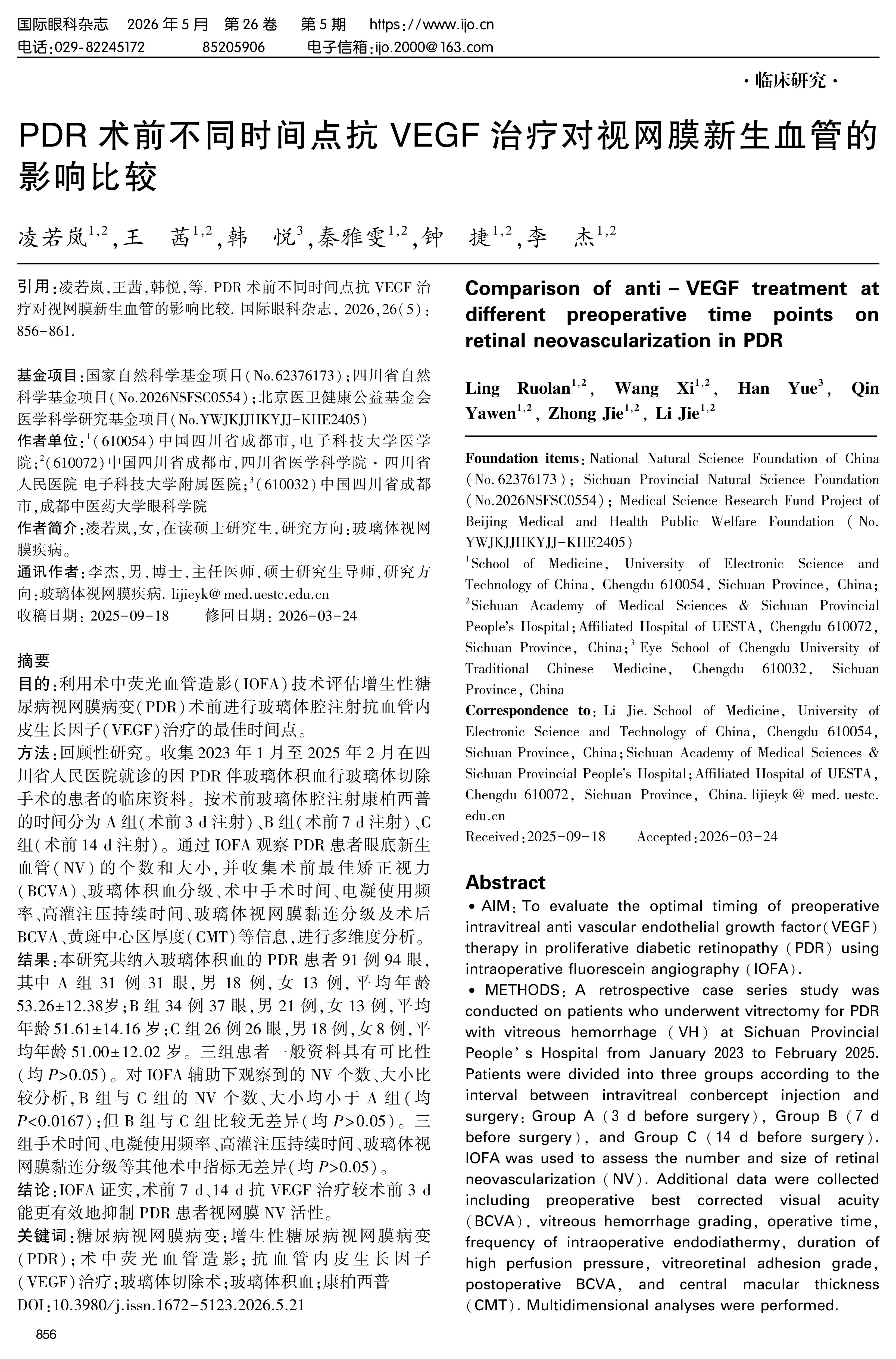 结论:IOFA证实,术前7 d、14 d抗VEGF治疗较术前3 d能更有效地抑制PDR患者视网膜NV活性。