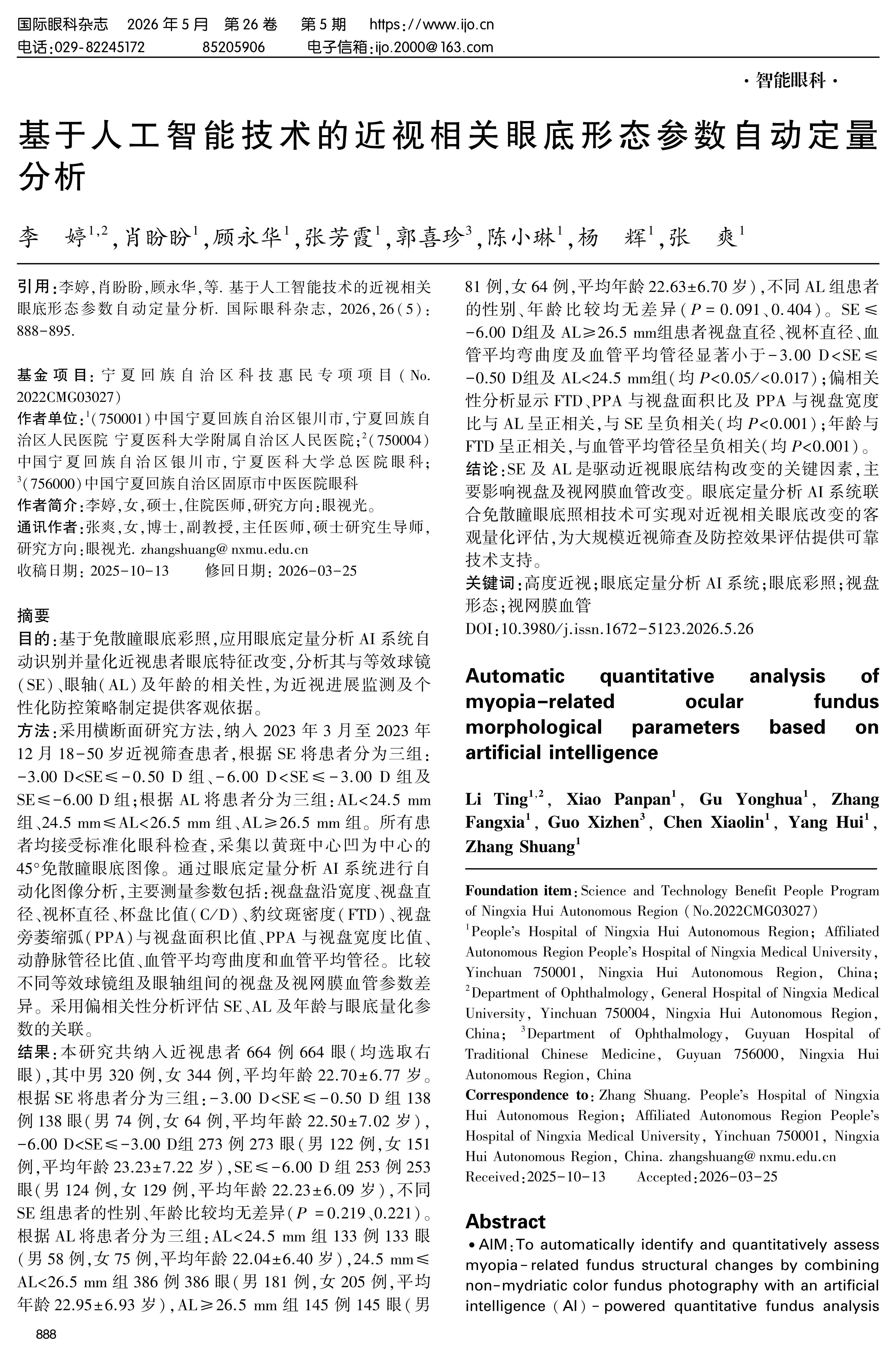 方法:采用横断面研究方法,纳入2023年3月至2023年12月18-50岁近视筛查患者,根据SE将患者分为三组:-3.00 D结果:本研究共纳入近视患者664例664眼(均选取右眼),其中男320例,女344例,平均年龄22.70±6.77岁。根据SE将患者分为三组:-3.00 DP =0.219、0.221)。根据AL将患者分为三组:AL<24.5 mm组133例133眼(男58例,女75例,平均年龄22.04±6.40岁),24.5 mm≤AL<26.5 mm组386例386眼(男181例,女205例,平均年龄22.95±6.93岁),AL≥26.5 mm组145例145眼(男81例,女64例,平均年龄22.63±6.70岁),不同AL组患者的性别、年龄比较均无差异(P=0.091、0.404)。SE≤-6.00 D组及AL≥26.5 mm组患者视盘直径、视杯直径、血管平均弯曲度及血管平均管径显著小于-3.00 DP<0.05/<0.017); 偏相关性分析显示FTD、PPA与视盘面积比及PPA与视盘宽度比与AL呈正相关,与SE呈负相关(均P<0.001); 年龄与FTD呈正相关,与血管平均管径呈负相关(均P<0.001)。结论:SE及AL是驱动近视眼底结构改变的关键因素,主要影响视盘及视网膜血管改变。眼底定量分析AI系统联合免散瞳眼底照相技术可实现对近视相关眼底改变的客观量化评估,为大规模近视筛查及防控效果评估提供可靠技术支持。