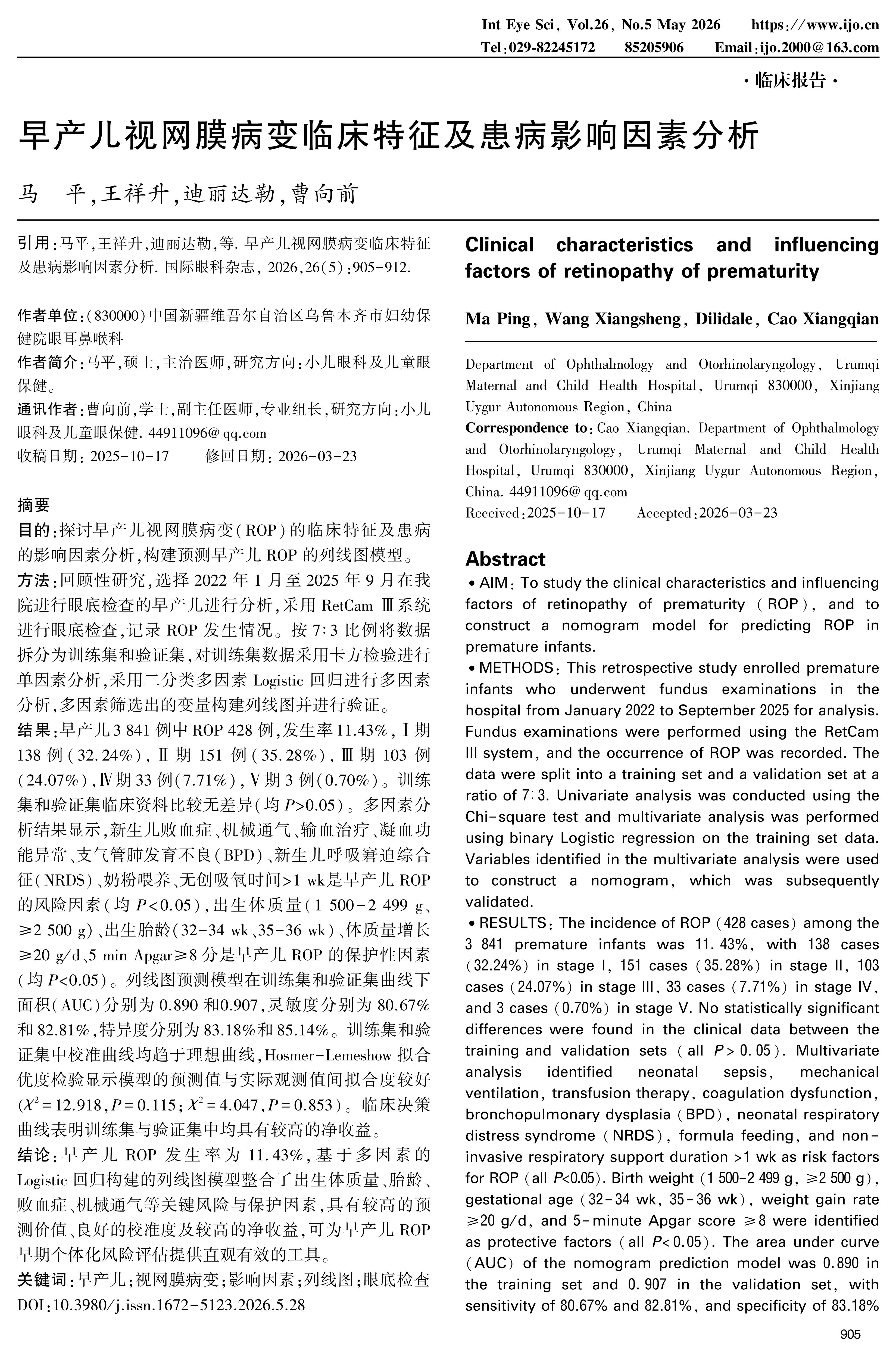 方法:回顾性研究,选择2022年1月至2025年9月在我院进行眼底检查的早产儿进行分析,采用RetCam Ⅲ系统进行眼底检查,记录ROP发生情况。按7:3比例将数据拆分为训练集和验证集,对训练集数据采用卡方检验进行单因素分析,采用二分类多因素Logistic回归进行多因素分析,多因素筛选出的变量构建列线图并进行验证。