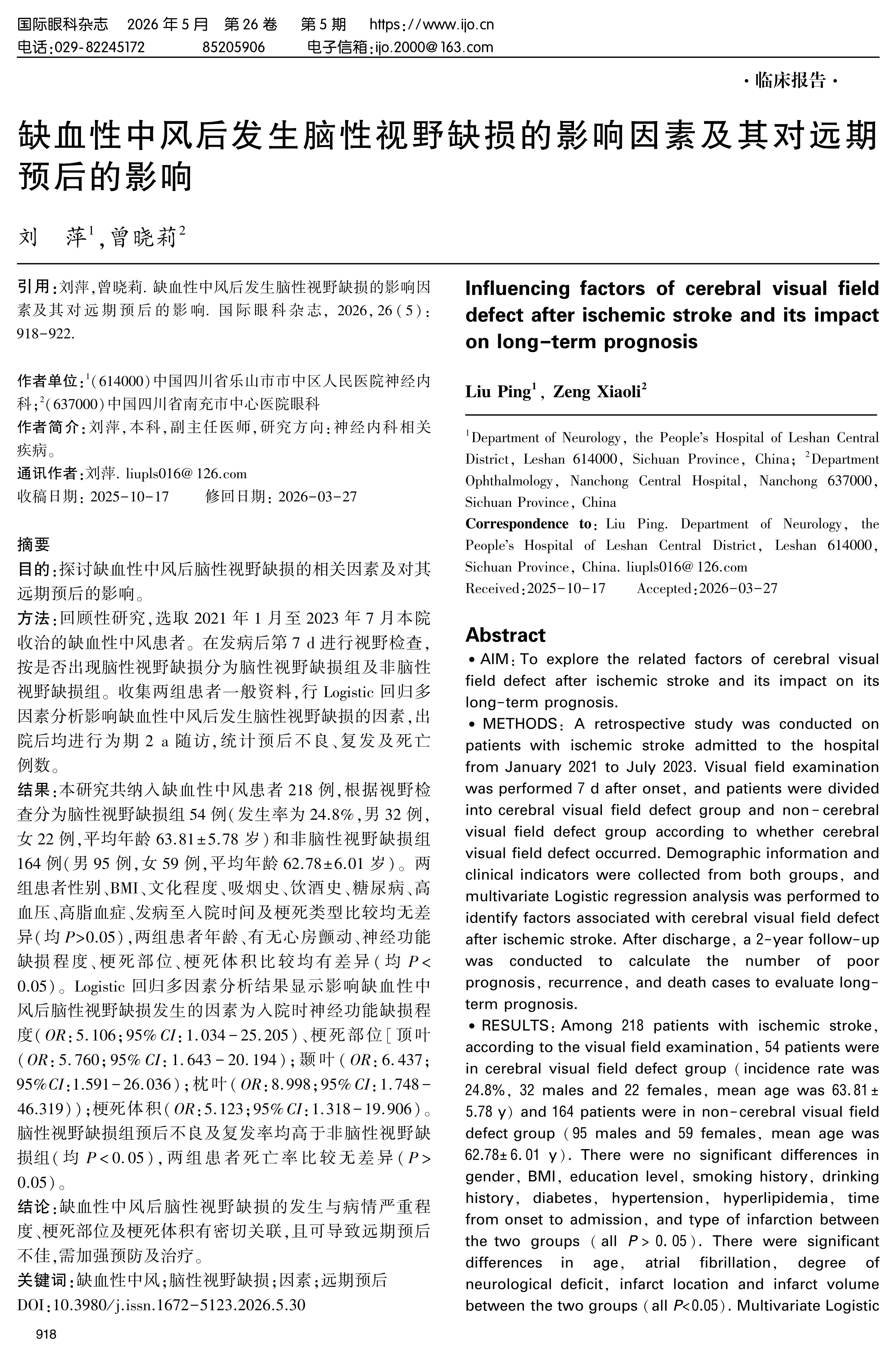 CONCLUSION:The occurrence of cerebral visual field defects after ischemic stroke is closely related to the severity of the condition, infarct location and infarct volume infarction, and can lead to poor long-term prognosis. Therefore, prevention and treatment should be strengthened.